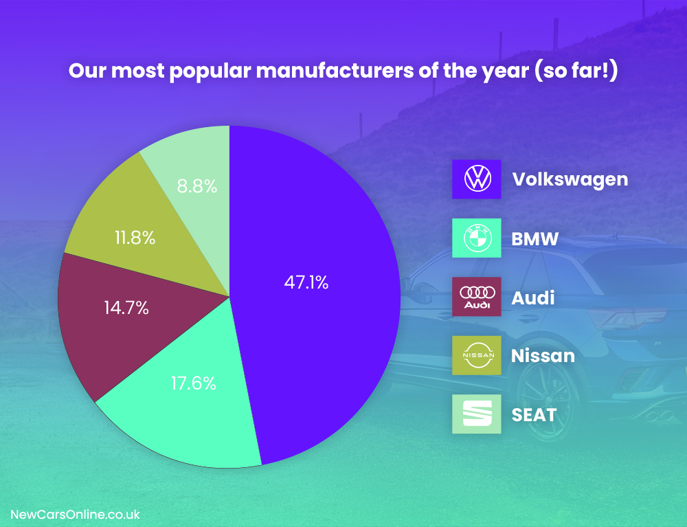 During the first part of 2021, we've had some fantastic Volkswagen Golf, T-Roc and Tiguan personal and business car leasing offers available for our customers so it's no surprise that a whopping 47.1% of the vehicles that we've delivered in 2021 has been a Volkswagen. BMW follows behind Volkswagen, thanks to the wildly popular BMW 2 Series Gran Coupe. Audi comes third place, with the A3 Sportback being the most popular model.